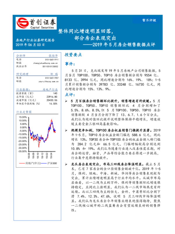 【首创证券】【20190603】2019年5月房企销售数据点评:整体同比增速明显回落,部分房企表现突出-3页 行业研究