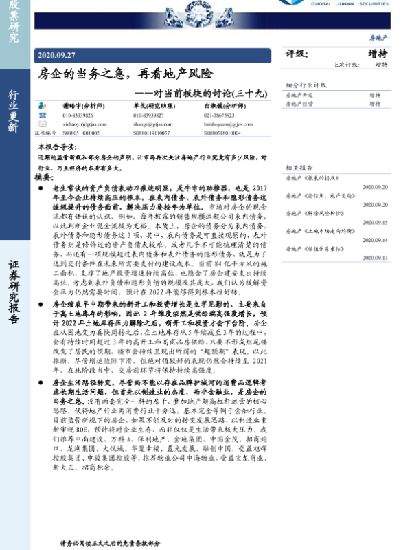 【国泰君安证券】【20200927】房企的当务之急,再看地产风险-3页 行业研究
