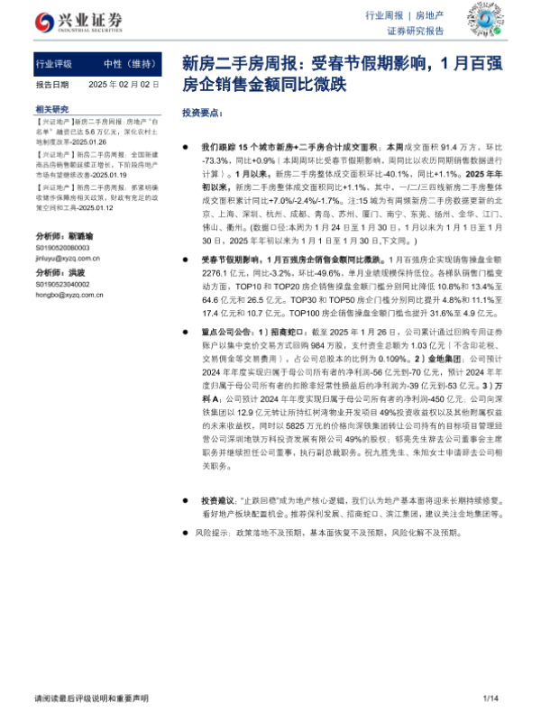 【兴业证券】【20250202】新房二手房周报:受春节假期影响,1月百强房企销售金额同比微跌-14页 行业研究