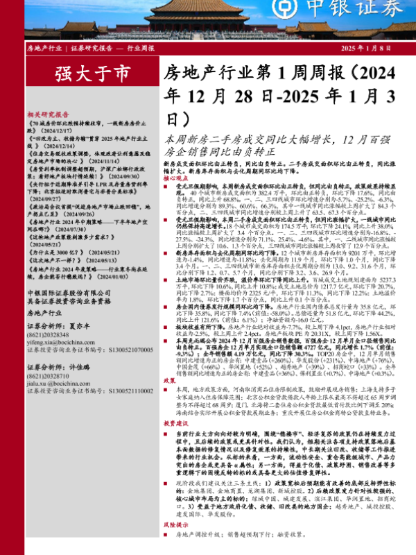 【中银证券】【20250108】房地产行业第1周周报:本周新房二手房成交同比大幅增长,12月百强房企销售同比由负转正-26页 行业研究