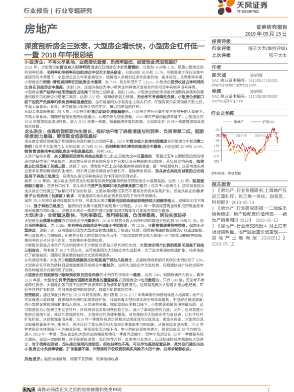 【天风证券】【20190515】房地产:暨2018年年报总结:深度剖析房企三张表-70页 行业研究