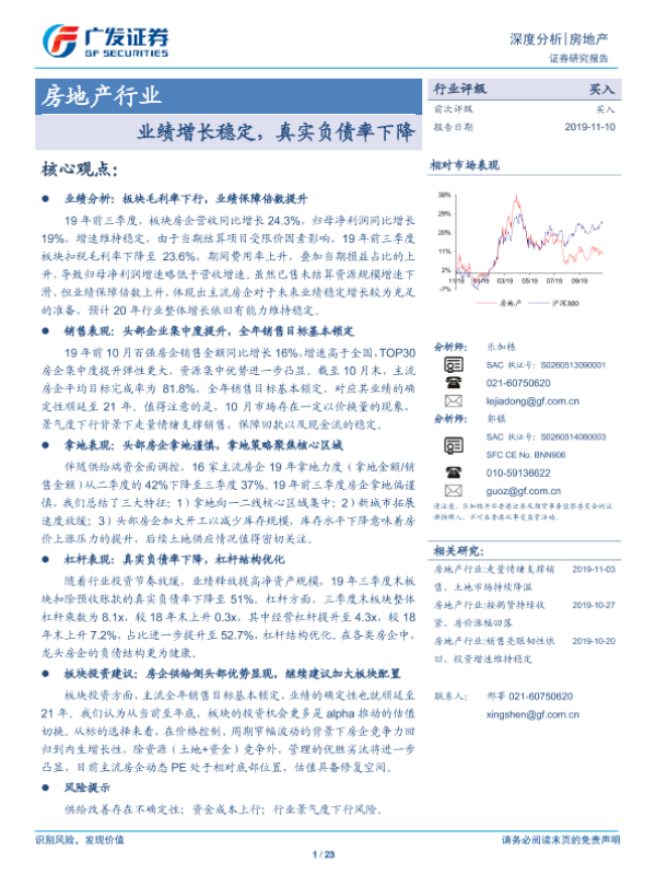 【广发证券】【20191110】房地产行业深度分析:业绩增长稳定,真实负债率下降-23页 行业研究