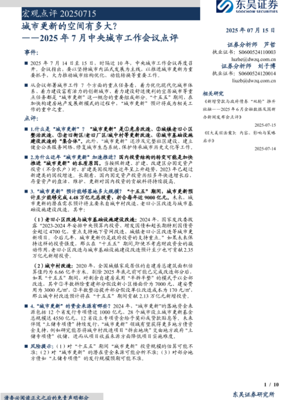 【东吴证券】【20250715】2025年7月中央城市工作会议点评:城市更新的空间有多大?-10页 宏观策略
