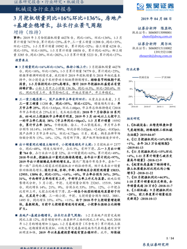 【东吴证券】【20190408】20190408-东吴证券-机械设备行业点评报告:3月挖机销量同比1.1.00+16%环比+136%,房地产+基建企稳增长,拉长行业景气周期-14页 行业研究