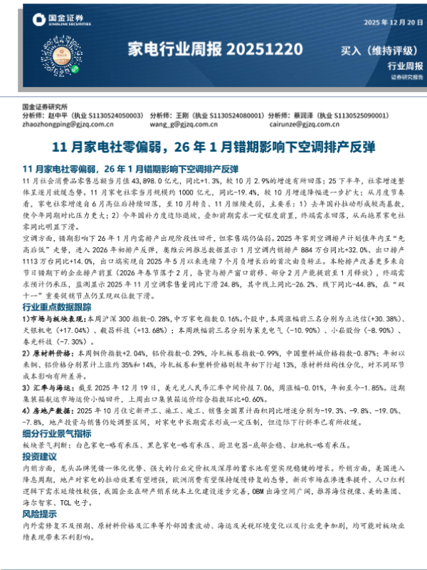 【国金证券】【202512】2025-12-21_国金证券_家电行业周报:11月家电社零偏弱,26年1月错期影响下空调排产反弹-11页 证券期货研究报告