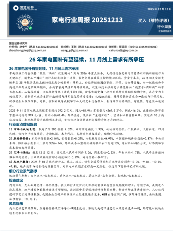 【国金证券】【202512】26年家电国补有望延续,11月线上需求承压-12页 证券期货研究报告