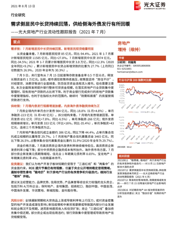 【光大证券】【20210813】光大房地产行业流动性跟踪报告:需求侧居民中长贷持续回落,供给侧海外债发行有所回暖-10页 行业研究