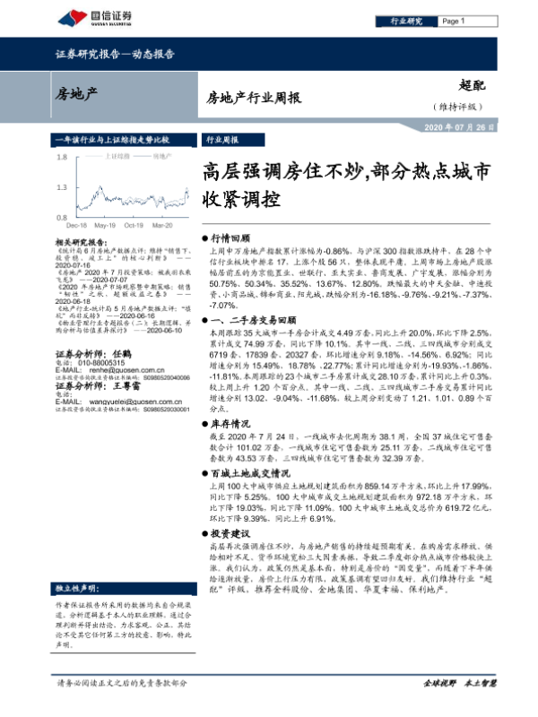 【国信证券】【20200726】房地产行业周报:高层强调房住不炒,部分热点城市收紧调控-15页 行业研究