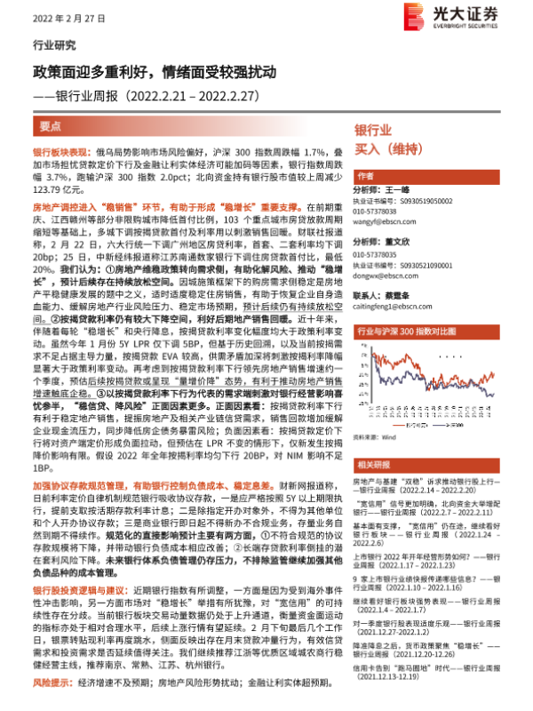 【光大证券】【20220227】银行业周报:政策面迎多重利好,情绪面受较强扰动-12页 行业研究