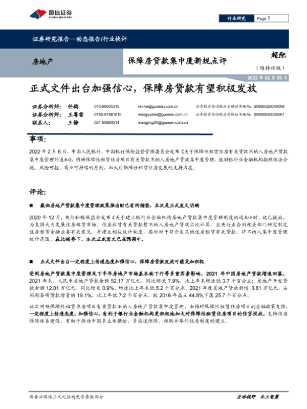 【国信证券】【20220209】保障房贷款集中度新规点评:正式文件出台加强信心,保障房贷款有望积极发放-5页 行业研究