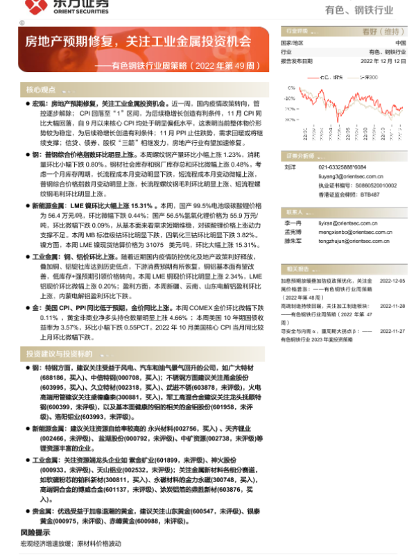 【东方证券】【20221212】20221212-东方证券-有色钢铁行业周策略(2022年第49周):房地产预期修复,关注工业金属投资机会-40页 行业研究