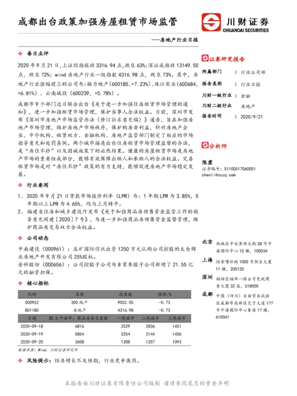 【川财证券】【20200921】房地产行业日报:成都出台政策加强房屋租赁市场监管-3页 证券期货研究报告
