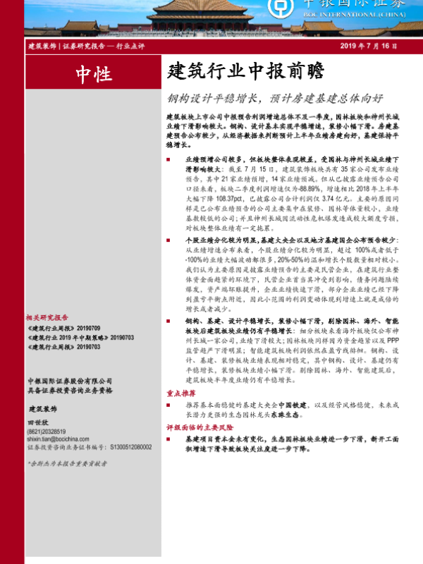 【中银证券】【20190716】建筑行业中报前瞻:钢构设计平稳增长,预计房建基建总体向好-9页 行业研究