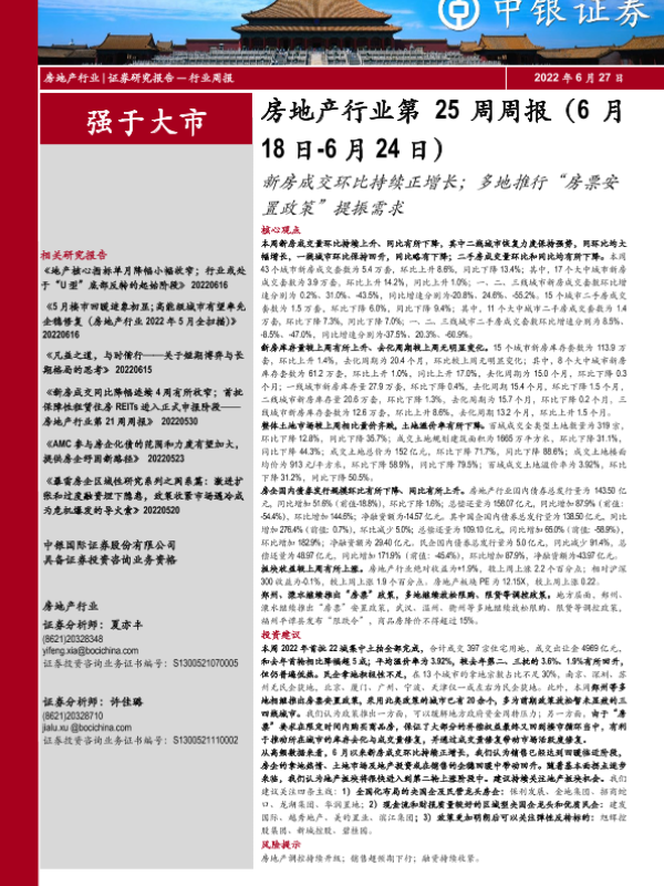 【中银证券】【20220627】房地产行业第25周周报:新房成交环比持续正增长;多地推行‘房票安置政策’提振需求-29页 行业研究