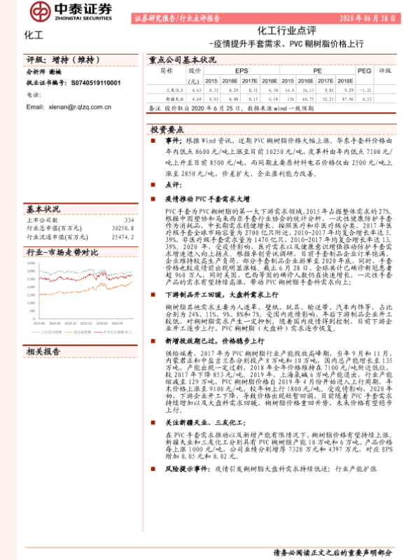 【中泰证券】【20200628】化工行业点评:疫情提升手套需求、PVC糊树脂价格上行-2页 行业研究