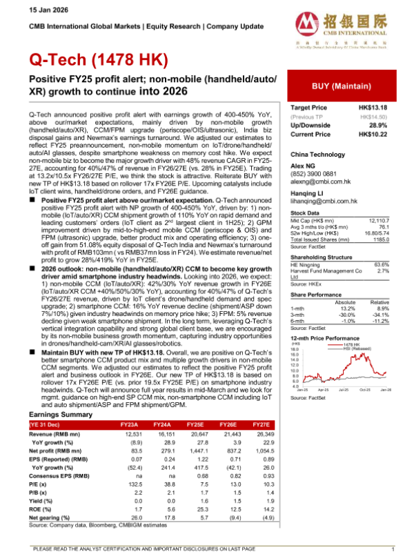 【CMB International Global Markets】【202601】Q-Tech(1478 HK)- Positive FY25 profit alert; non-mobile (handheld/auto/ XR) growth to continue into 2026-7页 公司研究