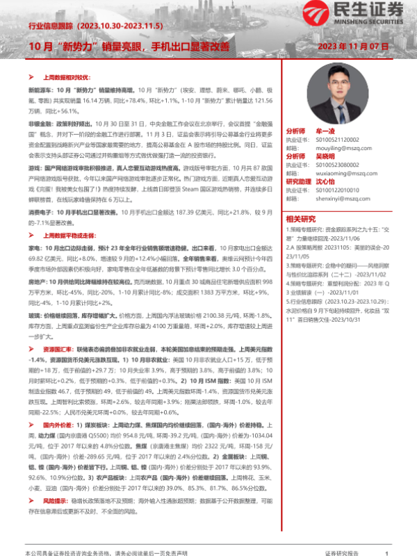 【民生证券】【20231107】行业信息跟踪:10月“新势力”销量亮眼,手机出口显著改善-31页 行业研究