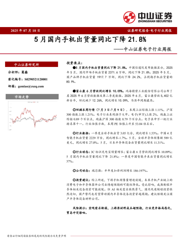 【中山证券】【20250710】5月国内手机出货量同比下降21.8%-10页 证券期货研究报告