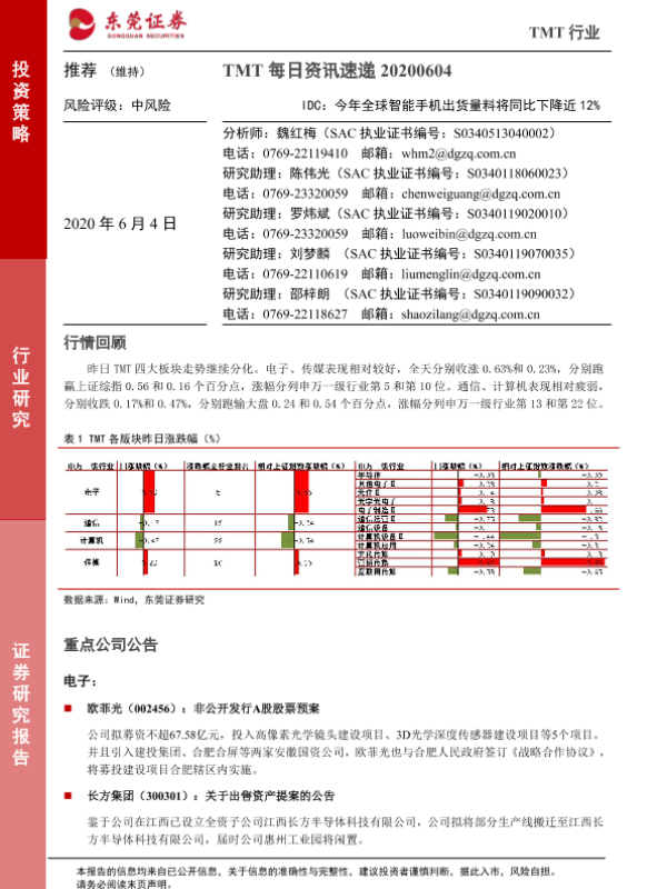 【东莞证券】【20200604】20200604-东莞证券-TMT每日资讯速递:IDC:今年全球智能手机出货量料将同比下降近12%-3页 行业研究