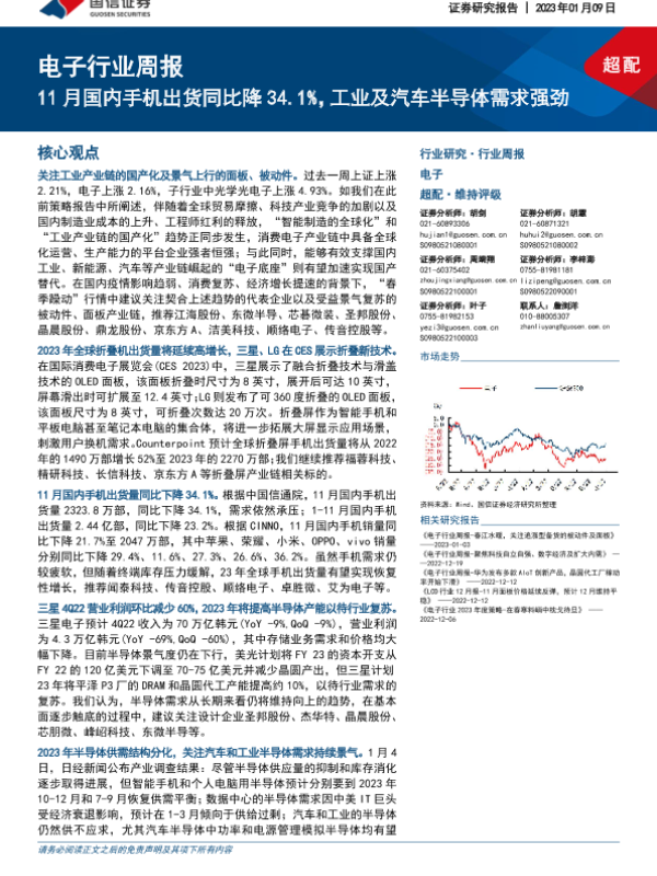 【国信证券】【20230109】20230109-国信证券-电子行业周报:11月国内手机出货同比降34.1%,工业及汽车半导体需求强劲-13页 行业研究