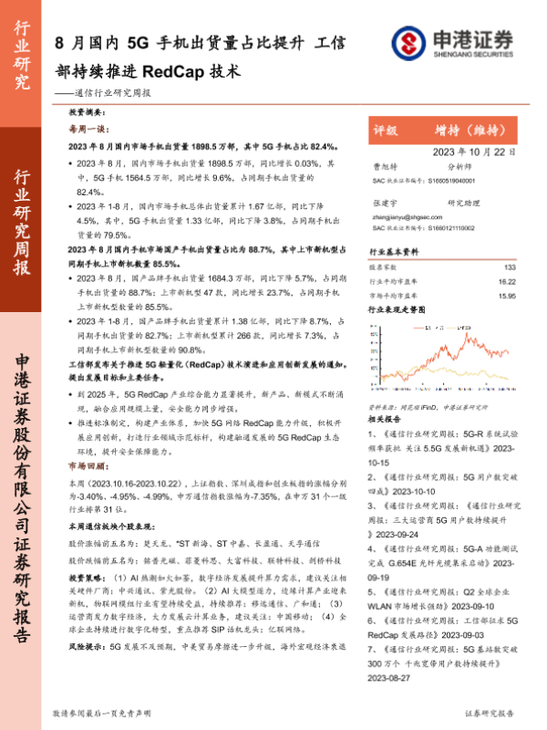 【申港证券】【20231022】20231022-申港证券-通信行业研究周报:8月国内5G手机出货量占比提升 工信部持续推进RedCap技术-11页 行业研究
