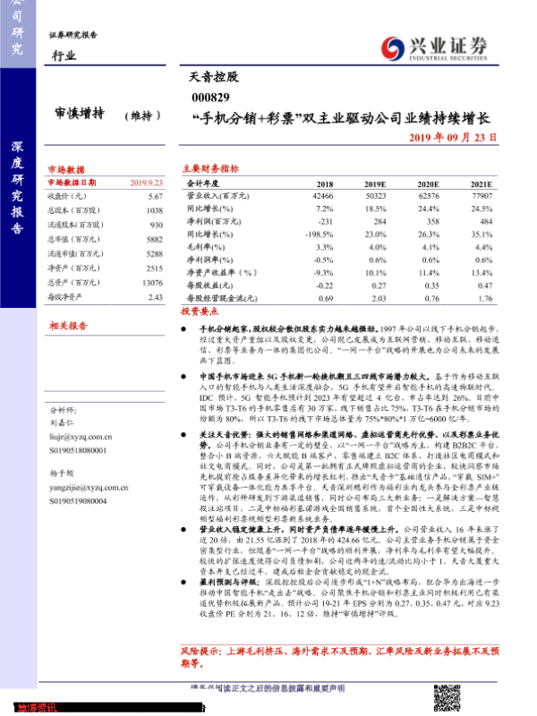 【兴业证券】【20190923】“手机分销+彩票”双主业驱动公司业绩持续增长-41页 行业研究