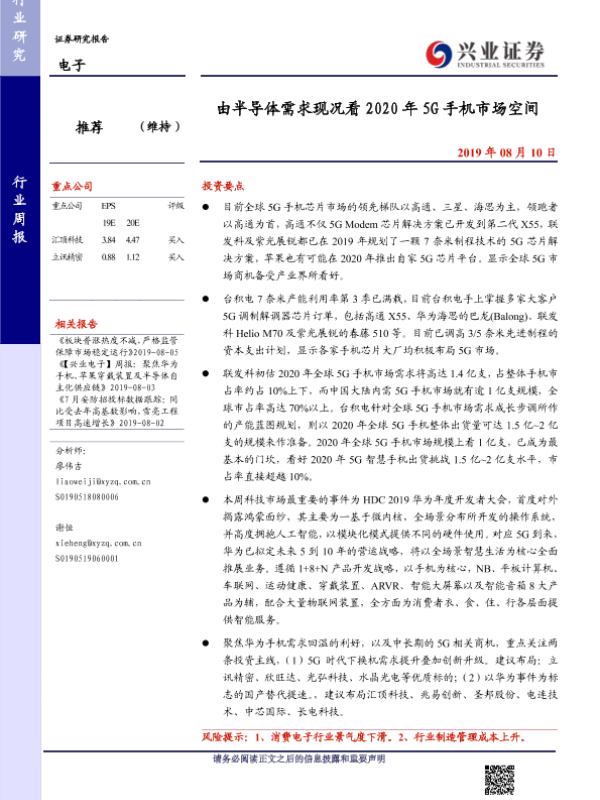 【兴业证券】【20190810】由半导体需求现况看2020年5G手机市场空间-13页 行业研究