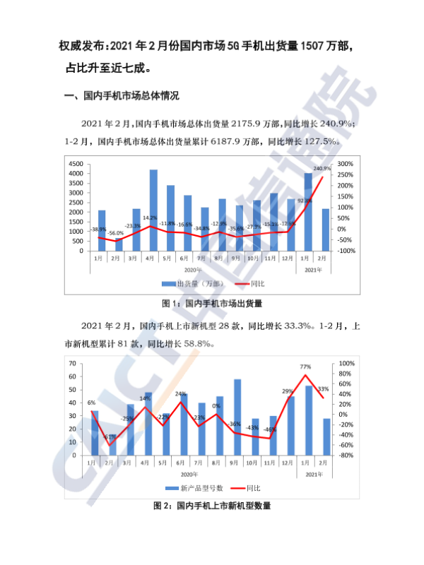 【中国信通院】【20210312】权威发布:2021年2月份国内市场5G手机出货量1507万部,占比升至近七成-3页 市场调研
