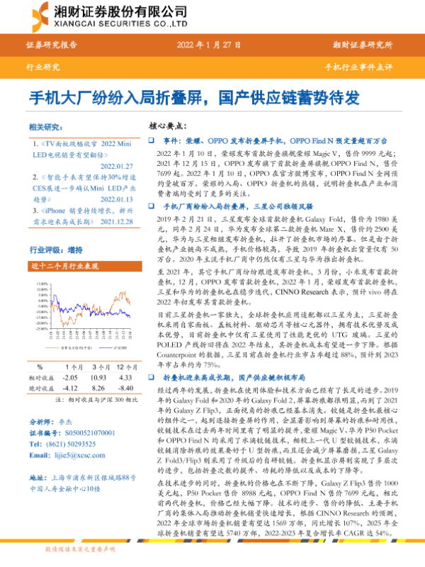 【湘财证券】【20220127】手机行业事件点评:手机大厂纷纷入局折叠屏,国产供应链蓄势待发-4页 行业研究