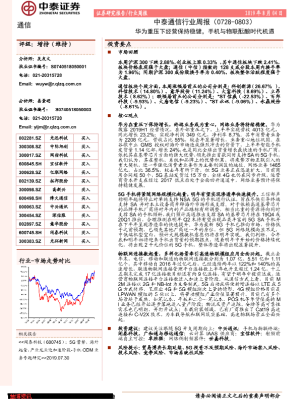 【中泰证券】【20190804】中泰通信行业周报:华为重压下经营保持稳健,手机与物联酝酿时代机遇-10页 行业研究