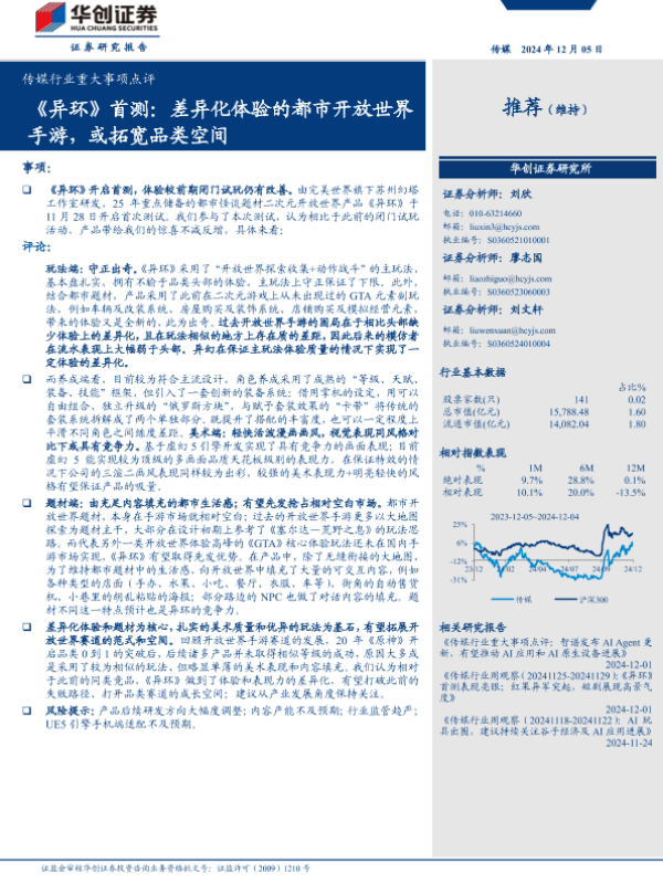 【华创证券】【20241205】传媒行业重大事项点评:《异环》首测,差异化体验的都市开放世界手游,或拓宽品类空间-11页 行业研究