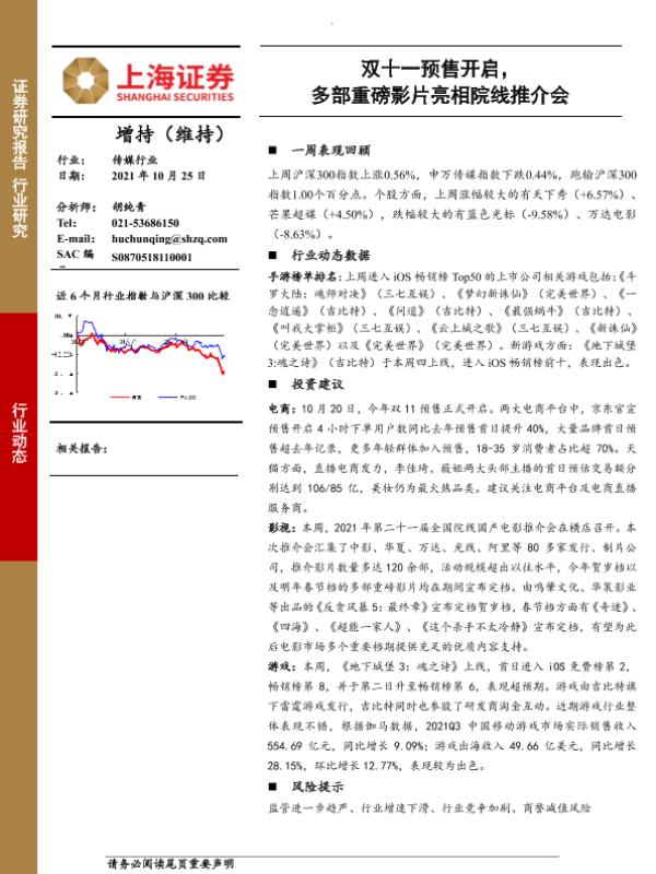 【上海证券】【20211025】20211025-上海证券-传媒行业:双十一预售开启,多部重磅影片亮相院线推介会-9页 行业研究