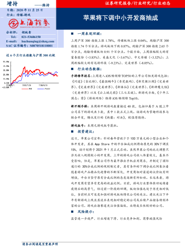 【上海证券】【20201125】20201125-上海证券-游戏行业动态:苹果将下调中小开发商抽成-9页 行业研究