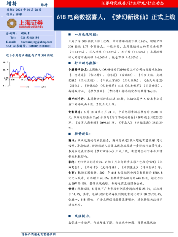 【上海证券】【20210628】20210628-上海证券-传媒行业动态:618电商数据喜人,《梦幻新诛仙》正式上线-8页 行业研究
