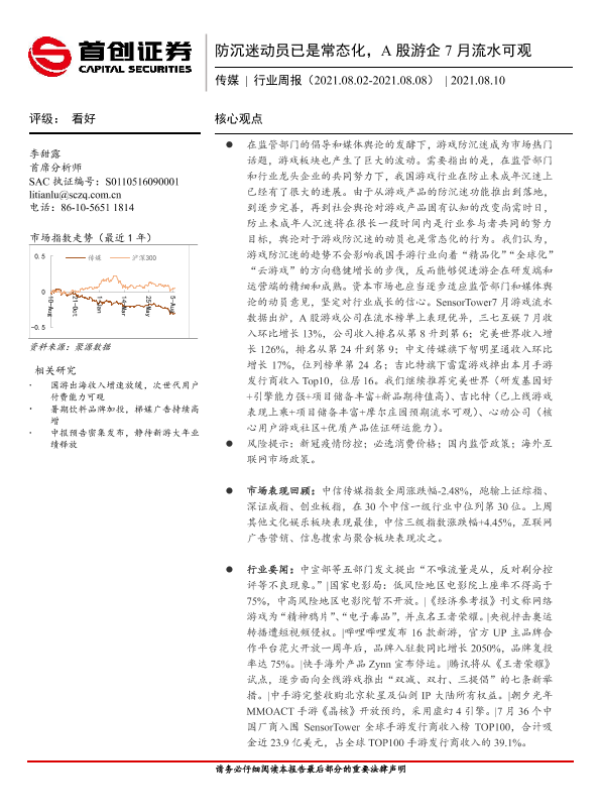 【首创证券】【20210810】防沉迷动员已是常态化,A股游企7月流水可观-11页 行业研究