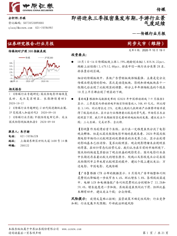 【中原证券】【20201019】即将迎来三季报密集发布期,手游行业景气度延续-21页 行业研究