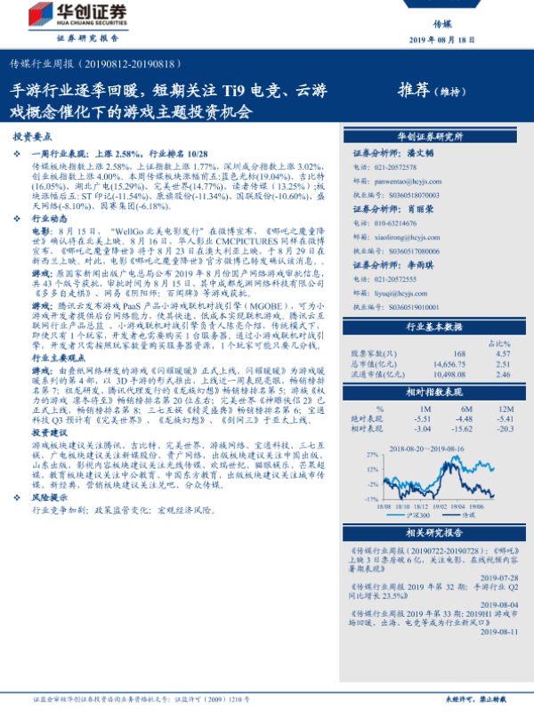 【华创证券】【20190818】20190818-华创证券-传媒行业周报:手游行业逐季回暖,短期关注Ti9电竞、云游戏概念催化下的游戏主题投资机会-15页 行业研究