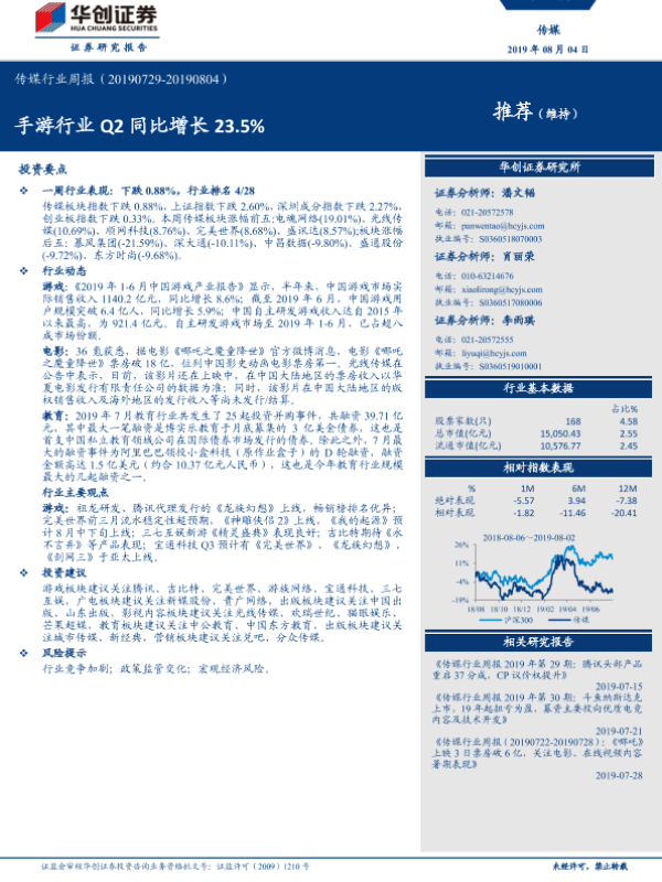 【华创证券】【20190804】20190804-华创证券-传媒行业周报:手游行业Q2同比增长23.5%-15页 行业研究