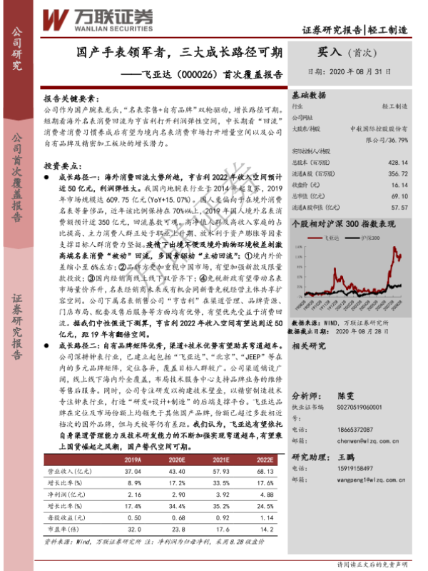 【万联证券】【20200831】20200831-万联证券-飞亚达-000026.SZ-首次覆盖报告:国产手表领军者,三大成长路径可期-39页 行业研究