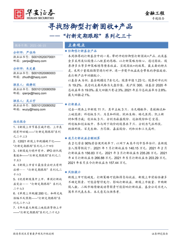【华安证券】【20210615】“打新定期跟踪”系列之三十:寻找防御型打新固收+产品-30页 行业研究