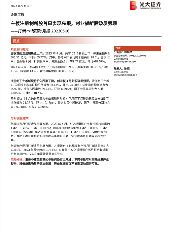 【光大证券】【20230506】打新市场跟踪月报:主板注册制新股首日表现亮眼,创业板新股破发频现-15页 行业研究
