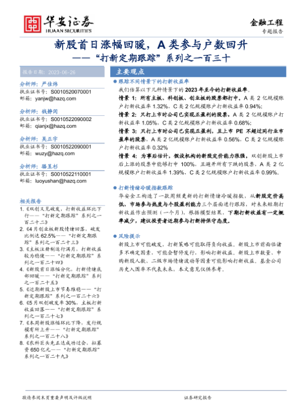 【华安证券】【20230626】“打新定期跟踪”系列之一百三十:新股首日涨幅回暖,A类参与户数回升-22页 行业研究