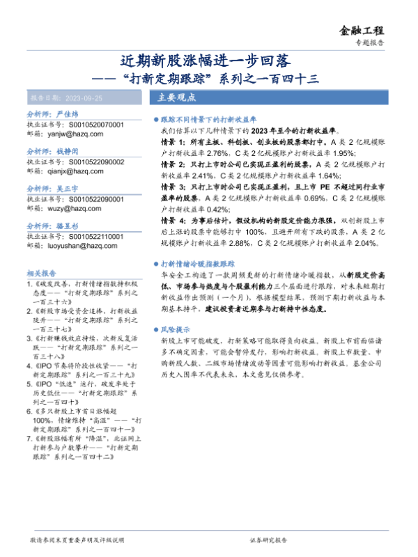 【华安证券】【20230925】“打新定期跟踪”系列之一百四十三:近期新股涨幅进一步回落-21页 行业研究