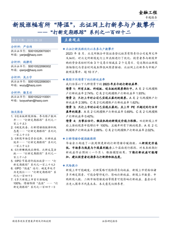 【华安证券】【20230918】打新定期跟踪系列之一百四十二:新股涨幅有所“降温”,北证网上打新参与户数攀升-21页 行业研究