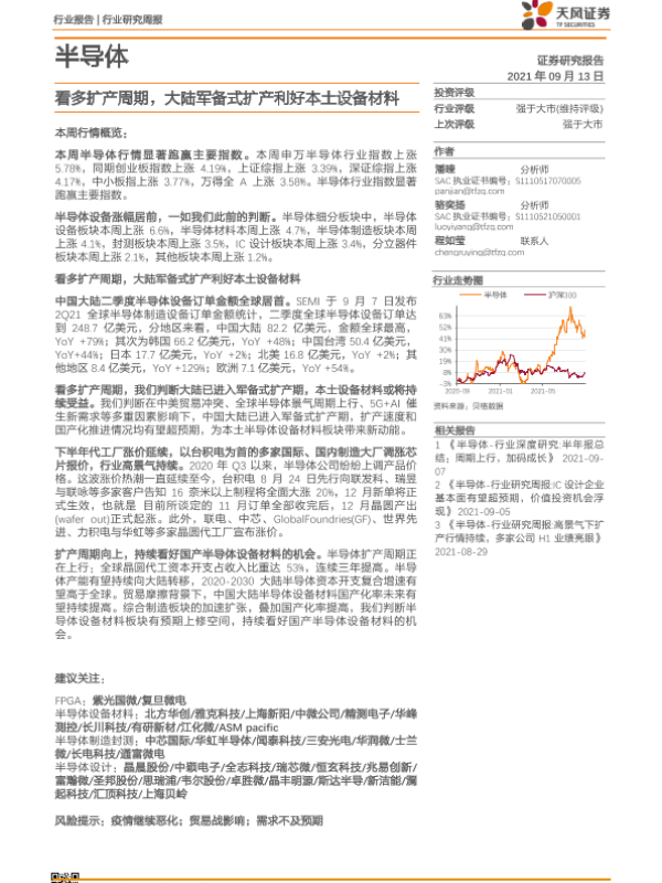 【天风证券】【20210913】20210913-天风证券-半导体行业研究周报:看多扩产周期,大陆军备式扩产利好本土设备材料-12页 行业研究