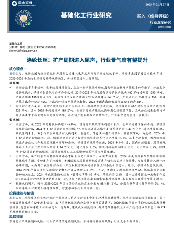 【国金证券】【20250206】基础化工行业研究:涤纶长丝:扩产周期进入尾声,行业景气度有望提升-19页 行业研究