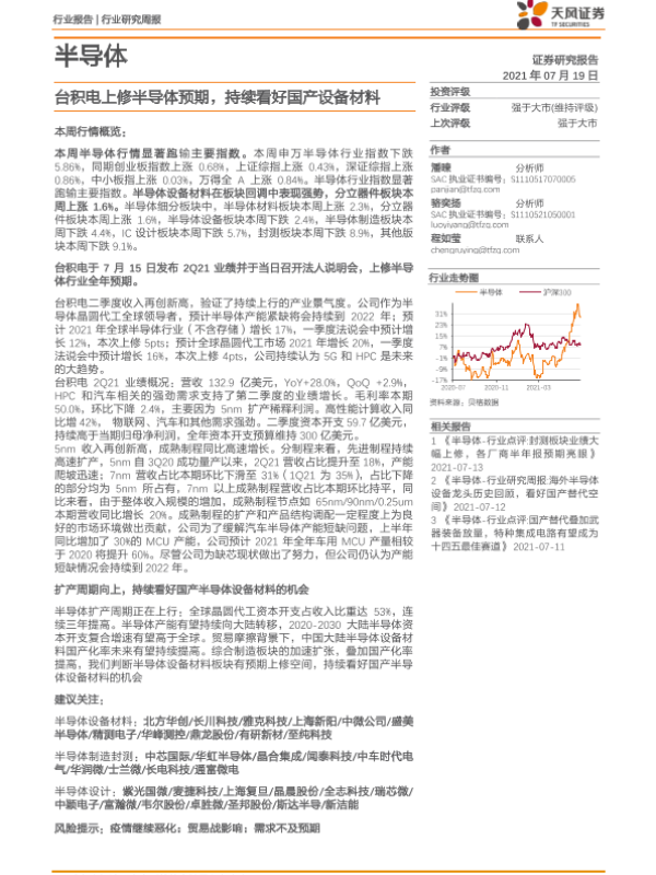 【天风证券】【20210719】20210719-天风证券-半导体行业研究周报:台积电上修半导体预期,持续看好国产设备材料-16页 行业研究