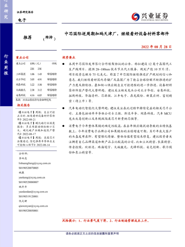 【兴业证券】【20220828】20220828-兴业证券-电子行业周报:中芯国际逆周期加码天津厂,继续看好设备材料零部件-9页 行业研究