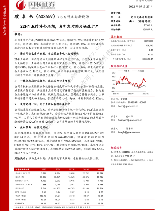 【国联证券】【20220727】22H1 业绩符合预期,发布定增助力快速扩产-3页 行业研究