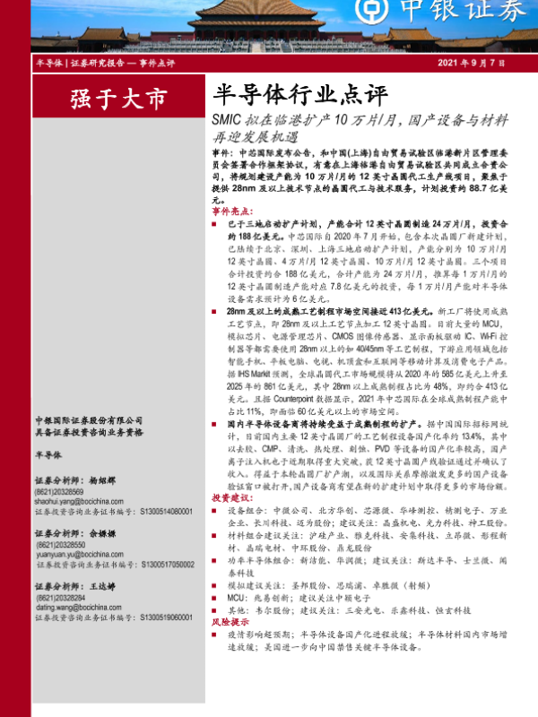 【中银证券】【20210907】中银证券-半导体行业点评:SMIC拟在临港扩产10万片/月,国产设备与材料再迎发展机遇-3页 行业研究